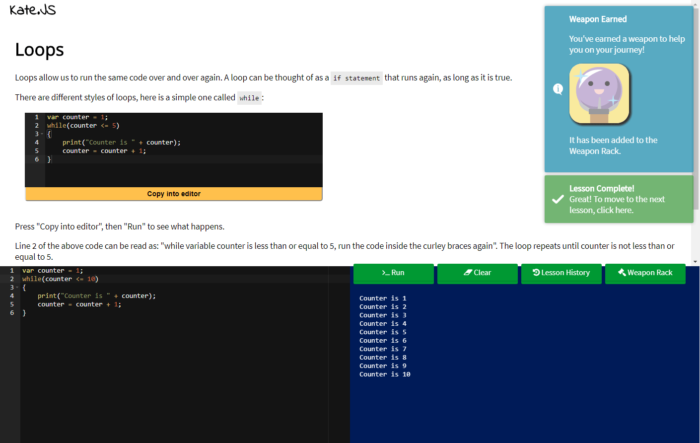 Kate.JS is a programming teaching tool, the target audience is newcomers to programming concepts. The tool teaches JavaScript specifically, but tries to keep language terms agnostic.