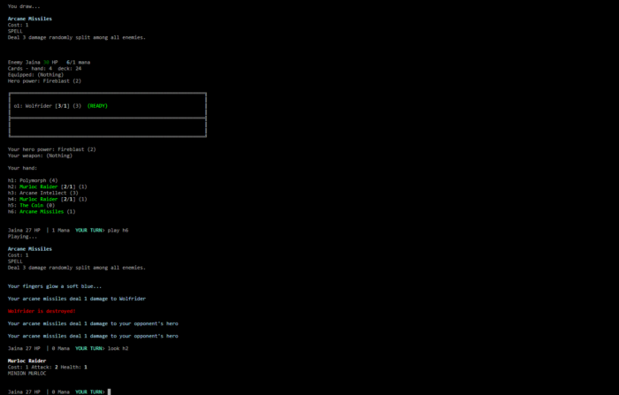 TextStone is a fan-made text-based port of the popular game “HearthStone: Heroes of Warcraft” by Blizzard Entertainment. In the text edition of the game, players compete in multiplayer against an opponent with their browser by entering commands into a terminal. All the card interactions of the original game are faithfully recreated in a thrilling text-only game.
